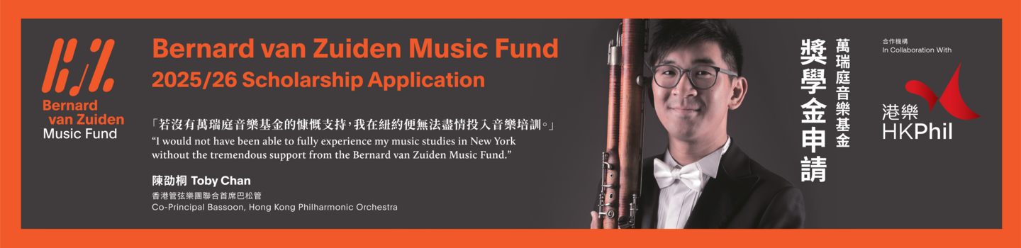 The Bernard van Zuiden Music Fund aims to provide financial aid for young Chinese music talent from Hong Kong to pursue musical training abroad. Recipients are committed to return to Hong Kong immediately upon finishing their studies and to contribute their talent to the Hong Kong music field.