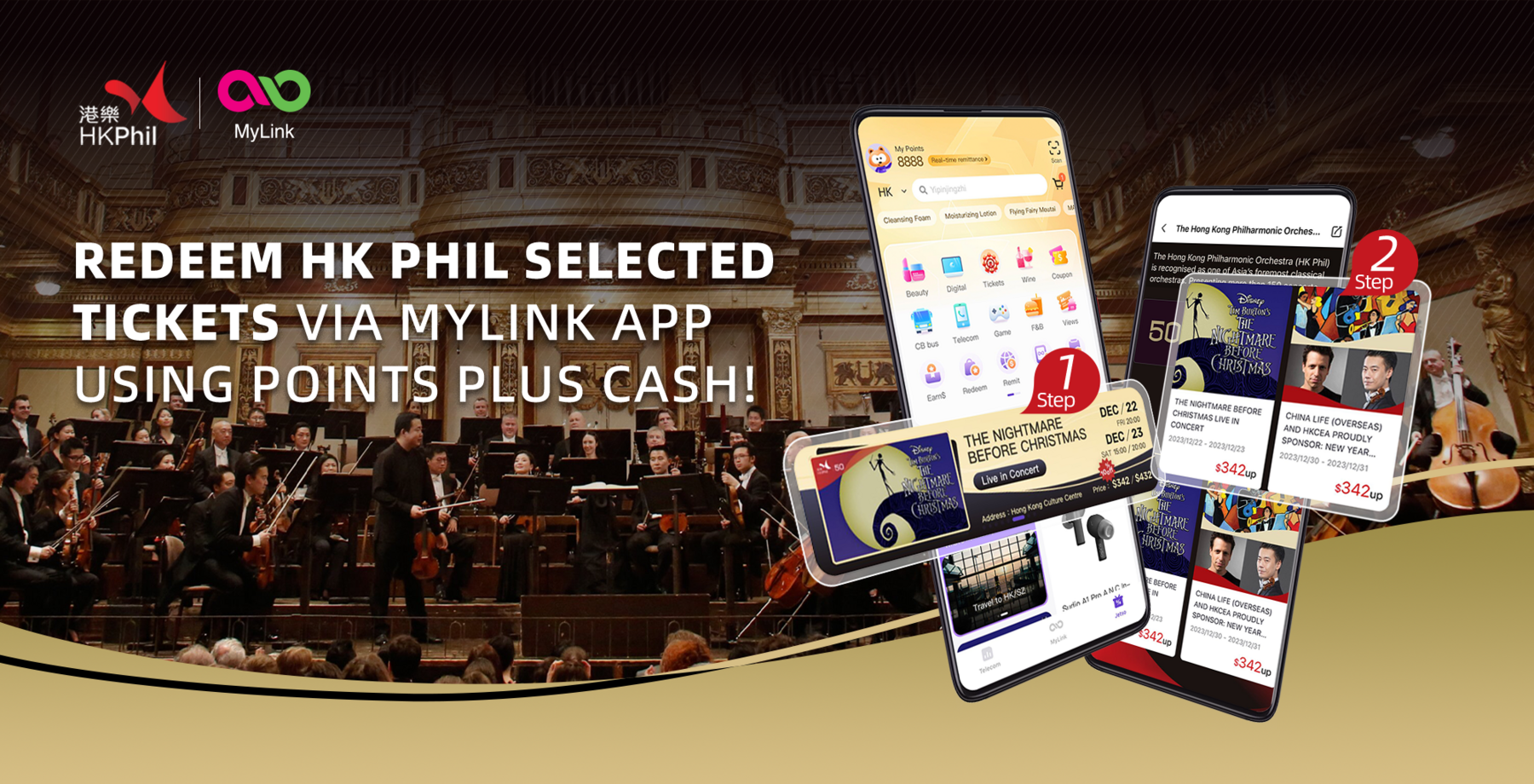 From today (December 8, 2023) until July 2024, selected concert tickets of HK Phil can be redeemed via the MyLink App using Points Plus Cash! For more details, please visit the HKPhil x MyLink page to stay updated with the latest information.
