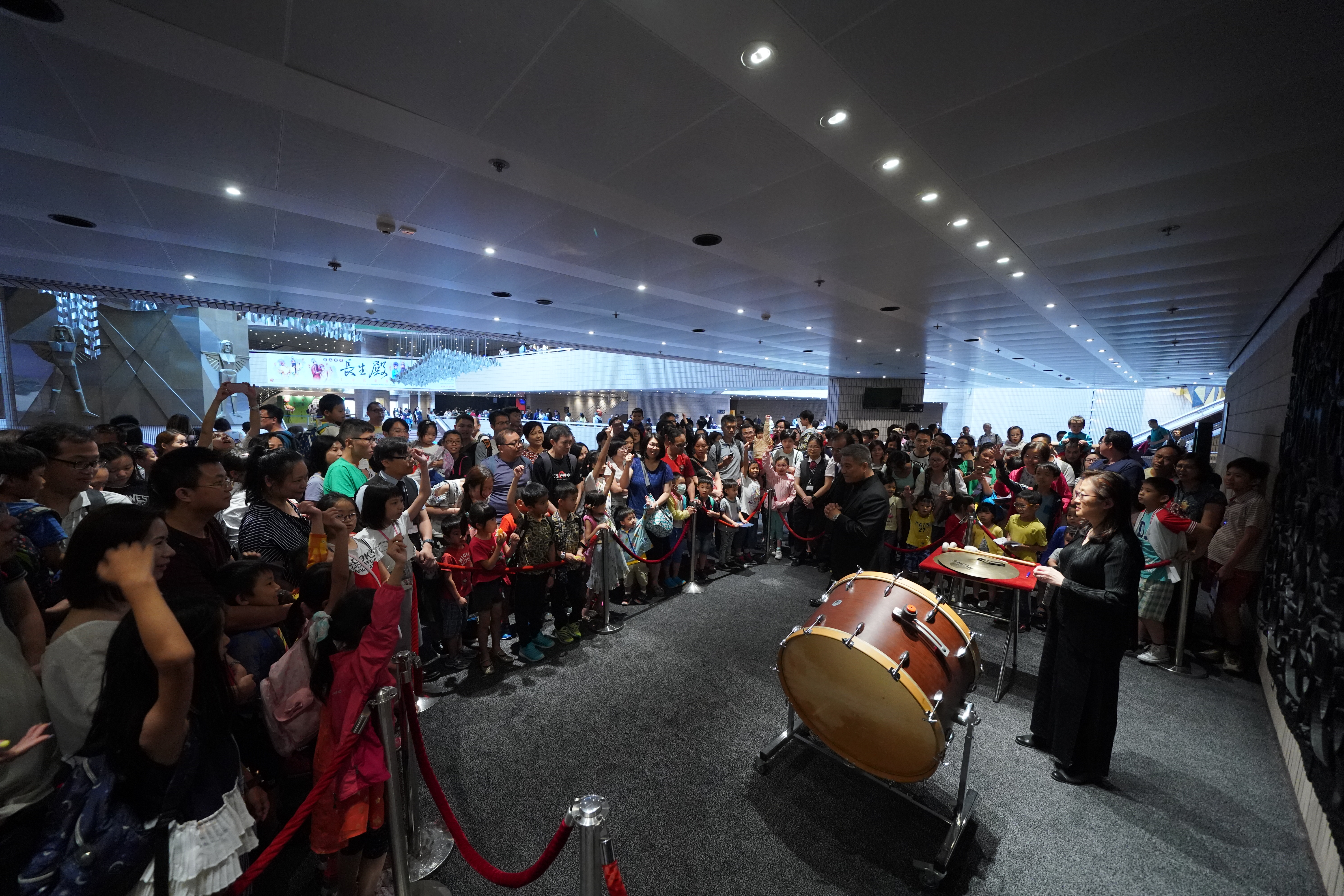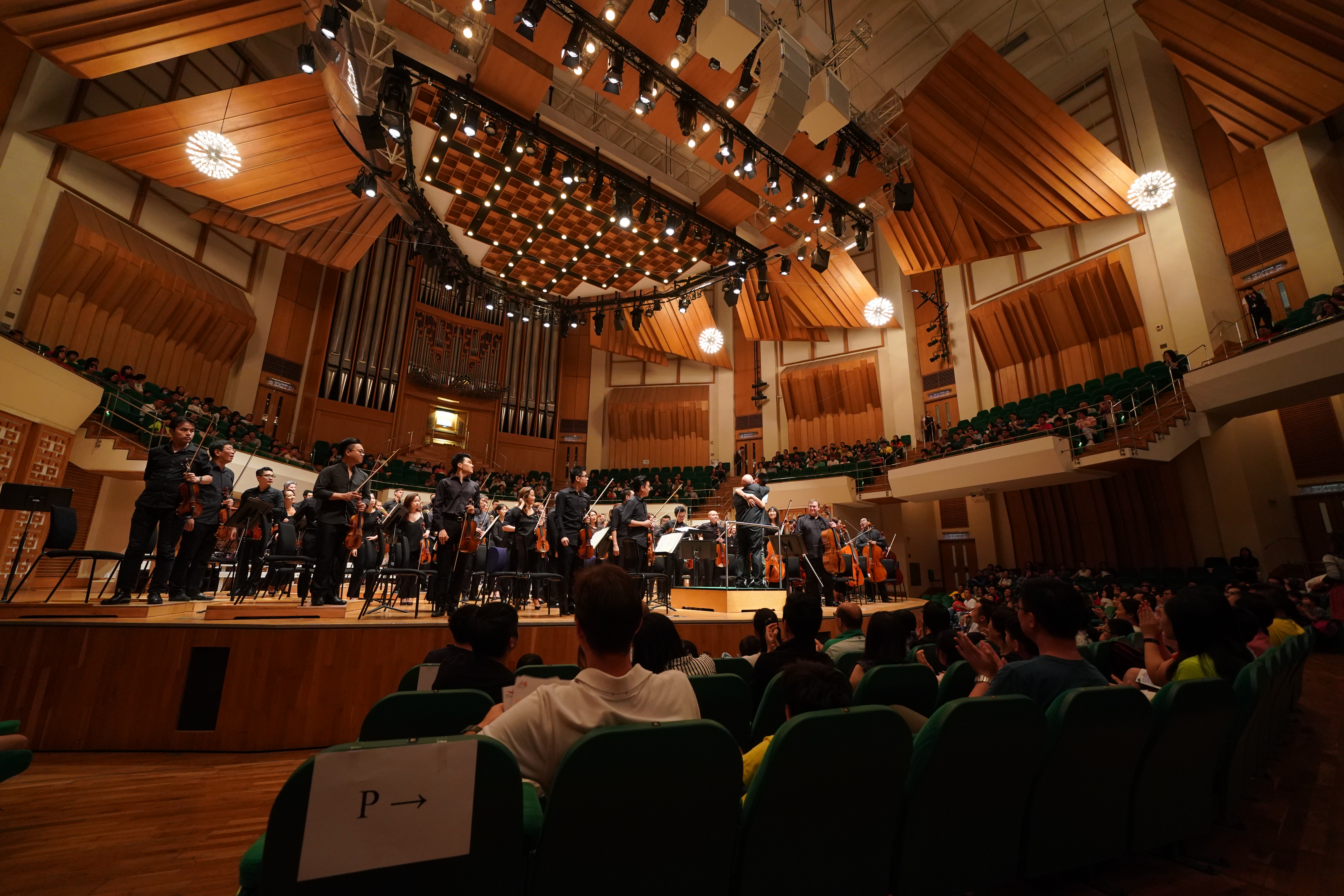 港樂音樂總監梵志登邀請現場觀眾隨著節奏拍手, | 音樂會後活動:敲擊樂器示範互動環節 |